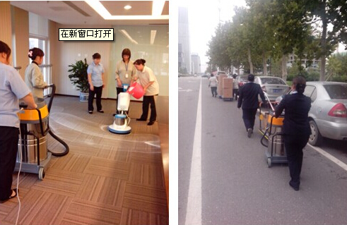 2014年9月29日,我们准备了充足的易耗品(卫生纸、擦手纸)和各种清洁药剂、机器设备(洗地机、吸水机)。其中最重要的环节是把这些物资从信用卡中心运送到研发中心,两楼距离约为800米左右,徒步行走需要10分钟。我们没有便捷高速的运输工具,只有靠四轮小推车进行运输,载满货物的小推车要经过两条马路,途径坑坑洼洼的路面,可谓困难重重。平时每星期一次的运送物料都可谓历经“劫难”,但我们风雨无阻,这一次又加上洗地机、吸水机两台设备。我们一行10人,六辆小推车浩浩荡荡从信用卡中心出发,途中的我们形成了一道靓丽的风景。